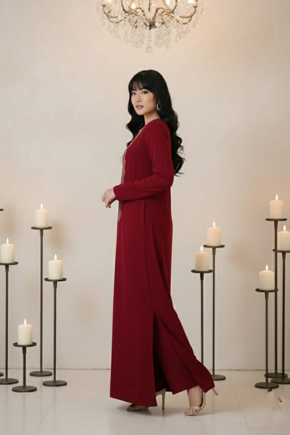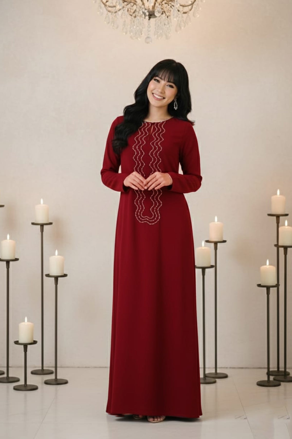 - This flared dress is cut on soft Crepe fabric. Featuring Emblishment on Neck. Full fitted raglan sleeves.