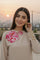 - The neckline with a statement floral patch, carefully placed to create a bold yet elegant focal point. The patch is further detailed with subtle embellishments to add texture and depth.