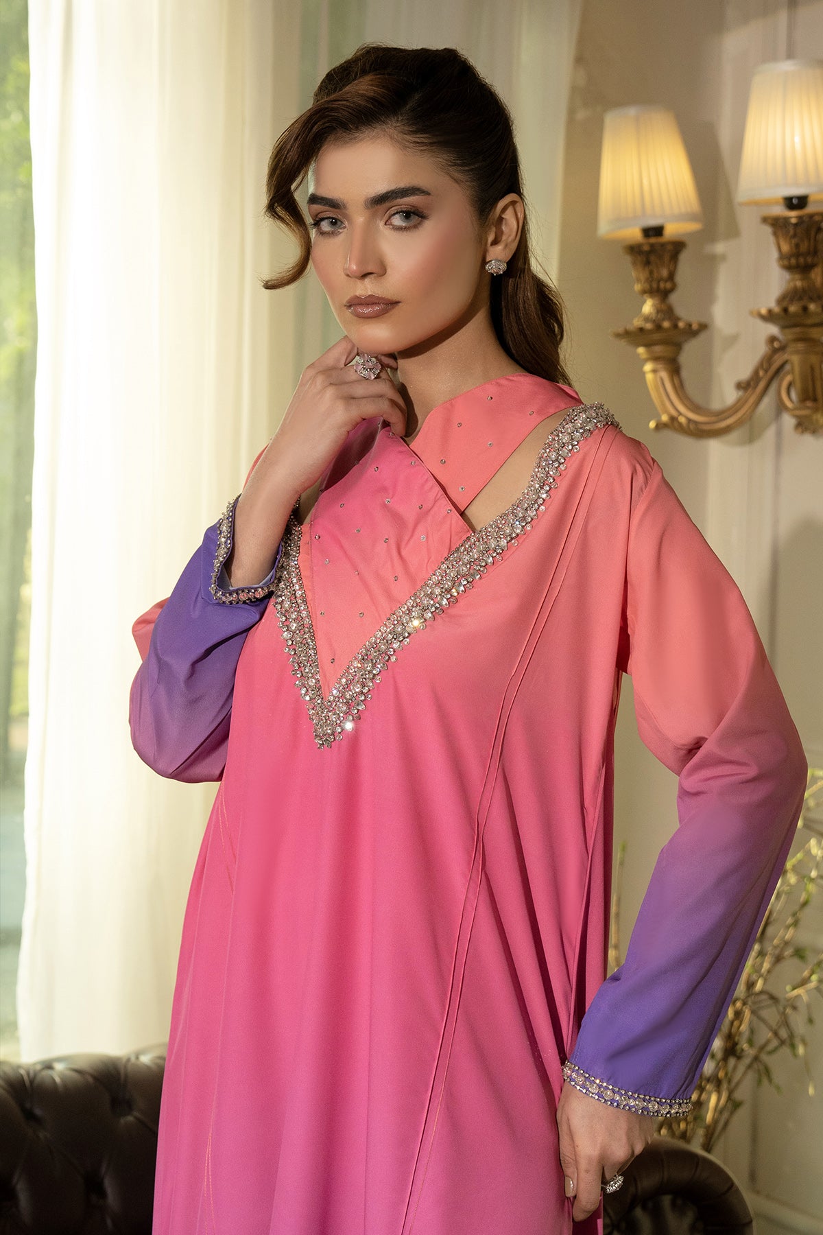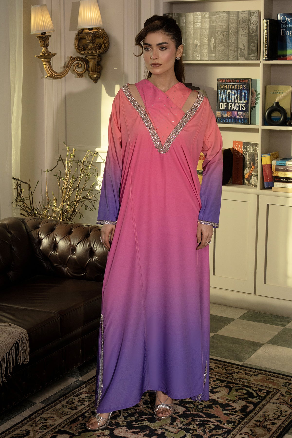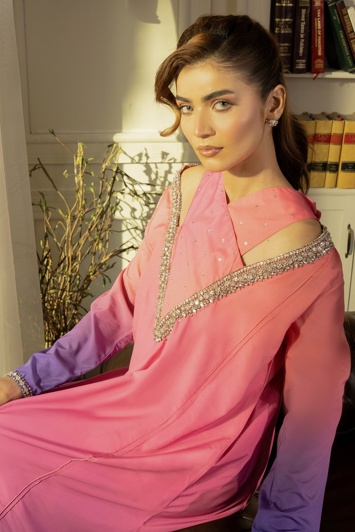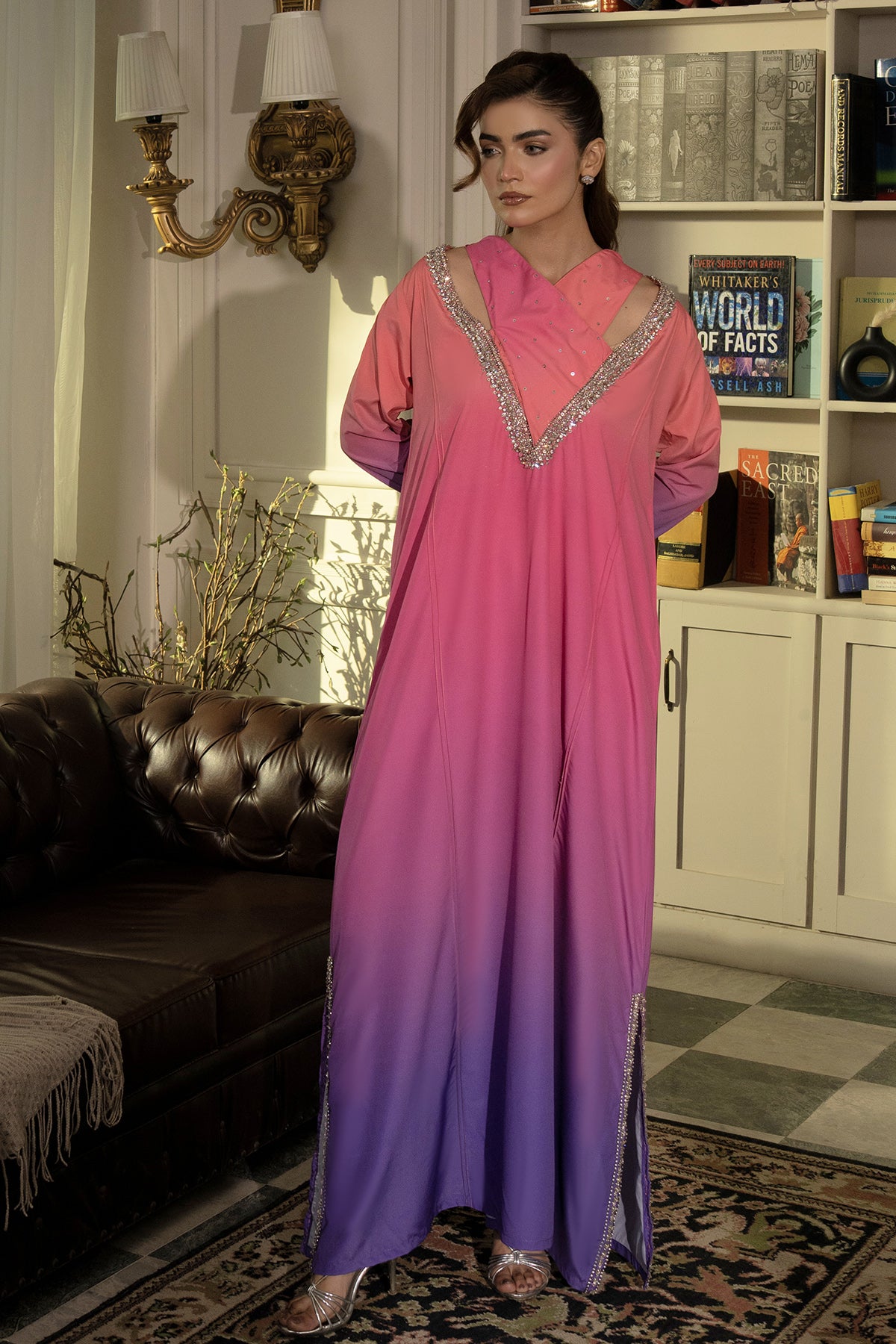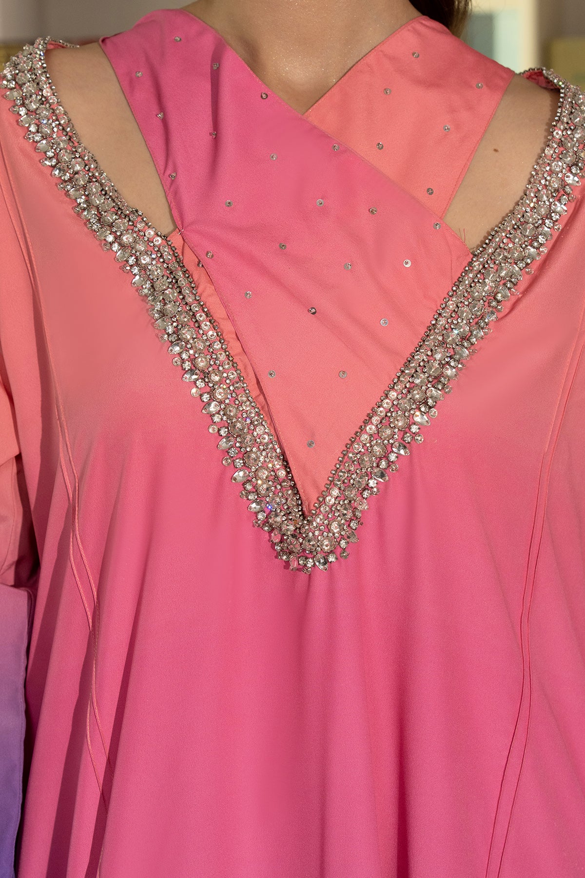 - This flared dress is cut on soft Crepe fabric. Featuring Emblishment on Neck , Side Slit & Sleeves. Full fitted raglan sleeves featuring embellihed edges which is further enhanced by a V neck.