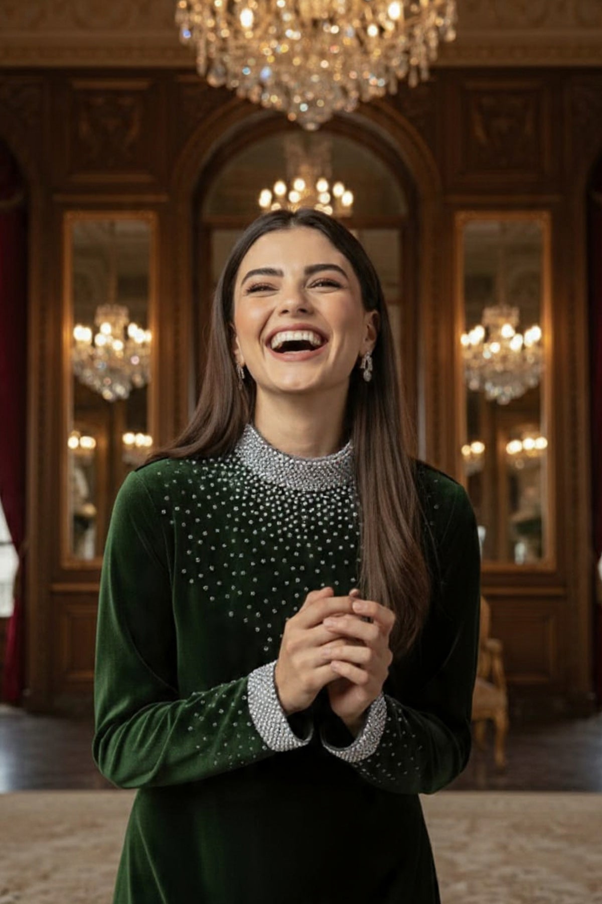 - This flared dress is cut on soft Velvet fabric. Featuring Emblishment on Neck & Sleeves. Full fitted raglan sleeves.